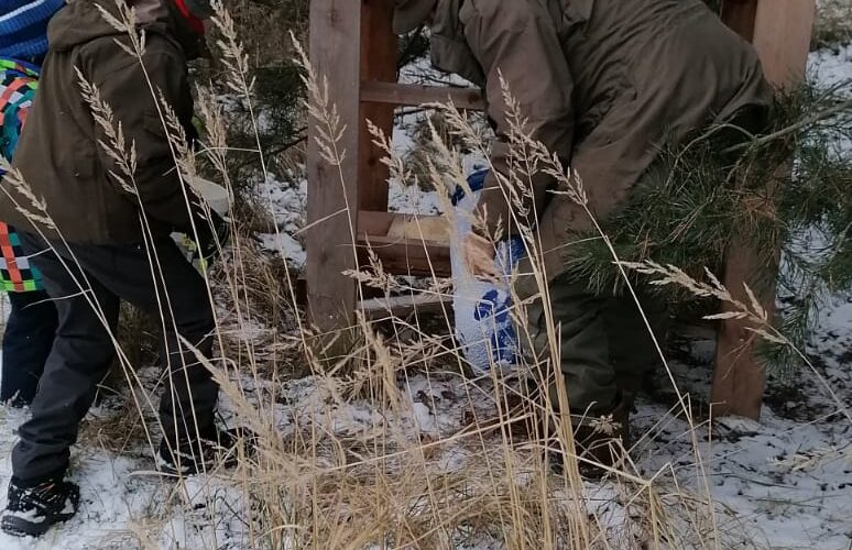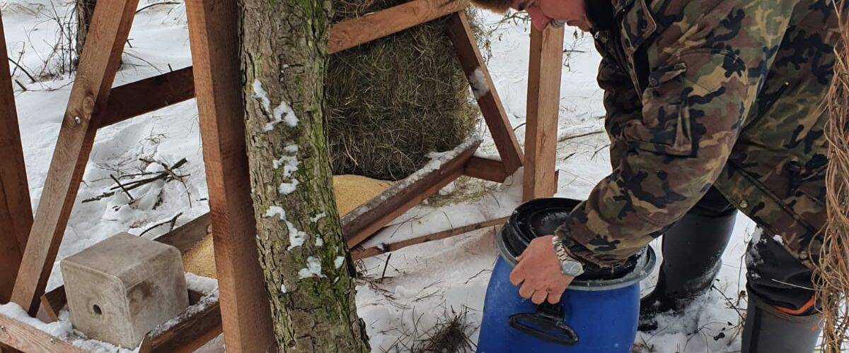 Koledzy Zdzisław Sadowski i Marek Sadowski wraz z młodymi adeptami łowiectwa uzupełniali paśniki sianem i wykładali preparat do odrobaczania saren i jeleni.